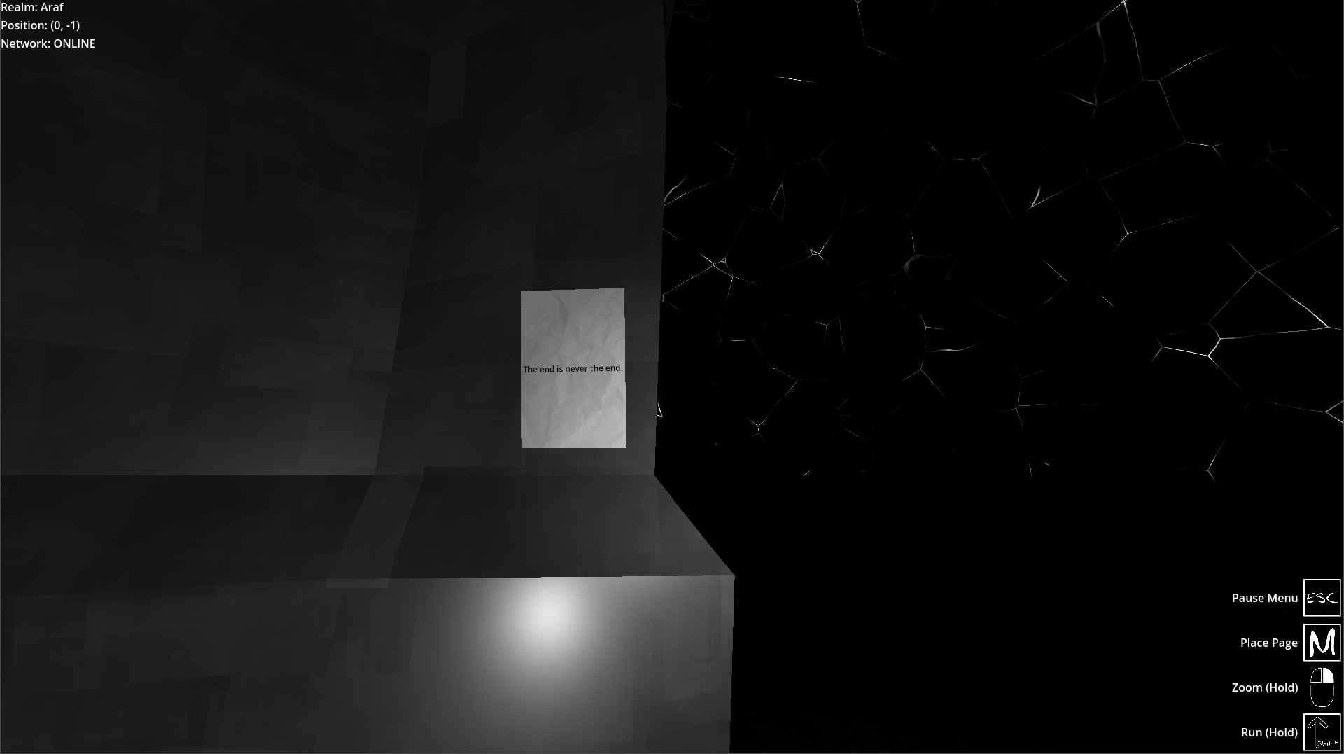 It is also a simple exploration game where you can go inbetween realms by finding portals and delving into the deep interwined realms where no one can read your last messages.